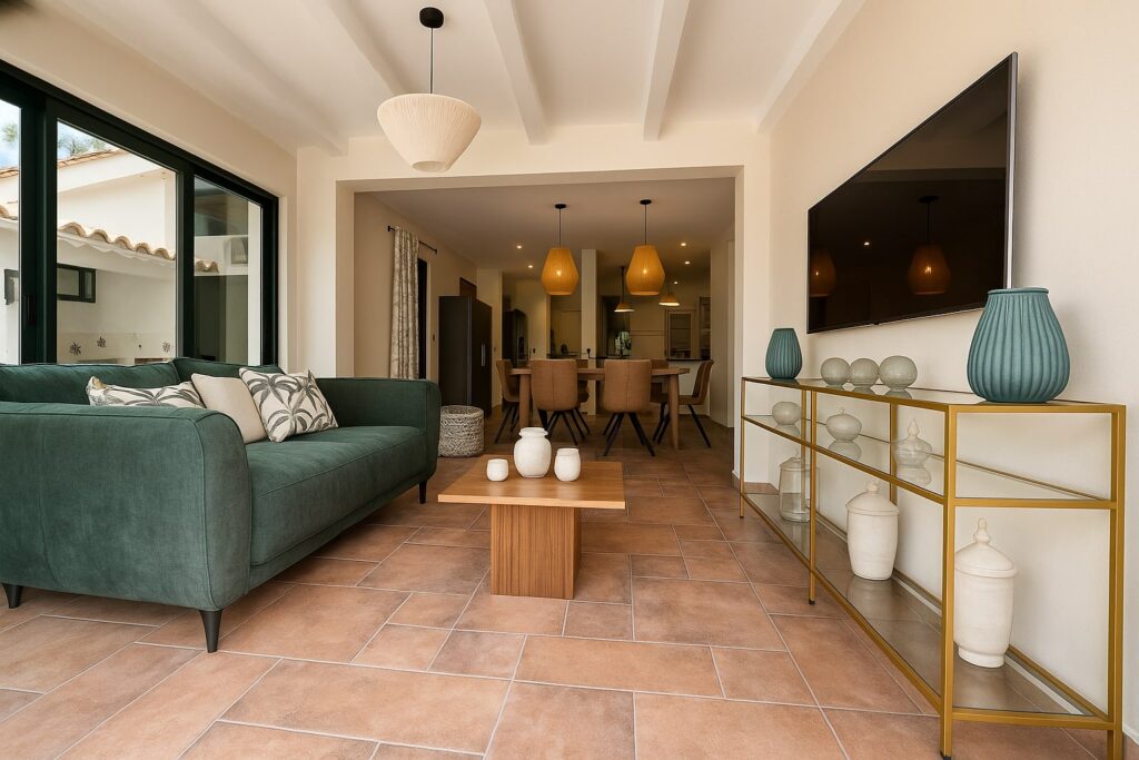 La Villa Oleandra ofrece cuatro dormitorios confortables y una habitación individual, con capacidad para hasta ocho personas. Todas las habitaciones cuentan con aire acondicionado, camas boxspring de alta calidad y baños modernos con duchas a ras de suelo. El amplio salón con cocina abierta y el invernadero con chimenea crean una atmósfera cálida y elegante – ideal para relajarse. El jardín con piscina ofrece frescura cuando no apetece ir a la playa.